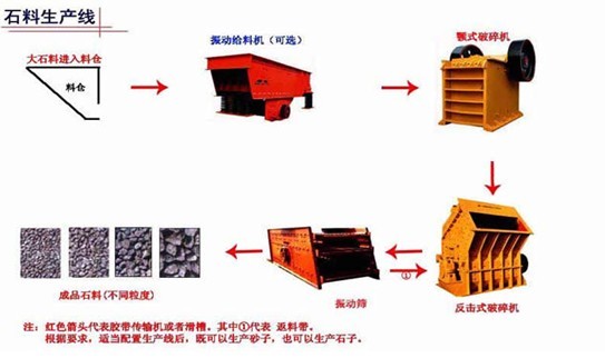 一、 石(shí)料生產線 基本流程介紹 石料由給料機均勻地送進粗碎機進行初步破碎,然後,產(chǎn)成的(de)粗料由皮帶輸送機輸(shū)送至反擊式破碎機進行進一步(bù)破碎,細碎後的石料進振動(dòng)篩篩分出不同規格的石(shí)子,不滿足粒度要求(qiú)的石子返料進反擊(jī)式破碎機再次破碎。